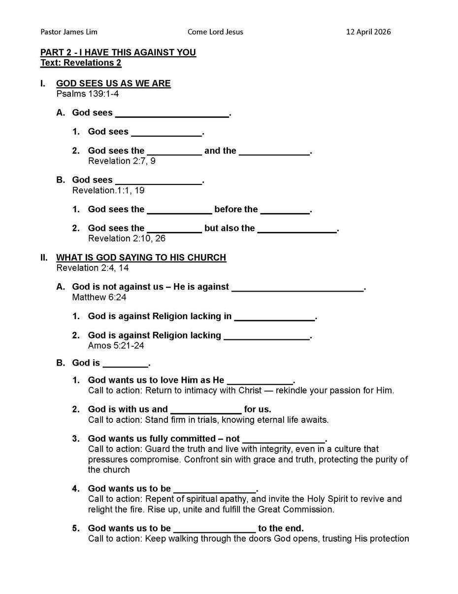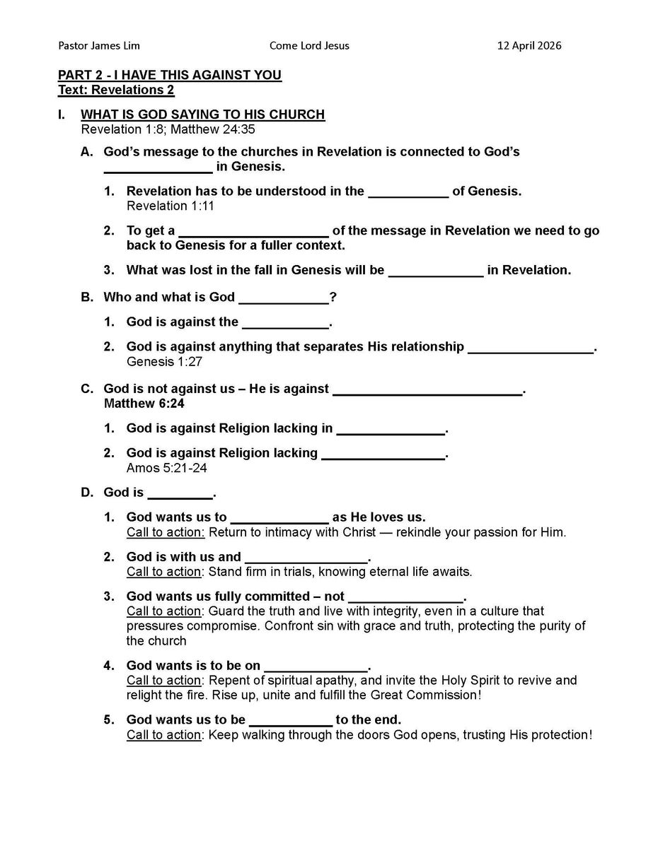 Come Lord Jesus Part 2 I have this against you Genesis to Revelation PJ